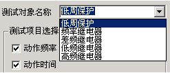 测试对象名称中包含“低周?;ぁ?、“频率继电器”、“差频继电器”、“低频继电器”以及“高频继电器”五种继电器。默认情况下选择“低周保护”。其下拉菜单如图所示: