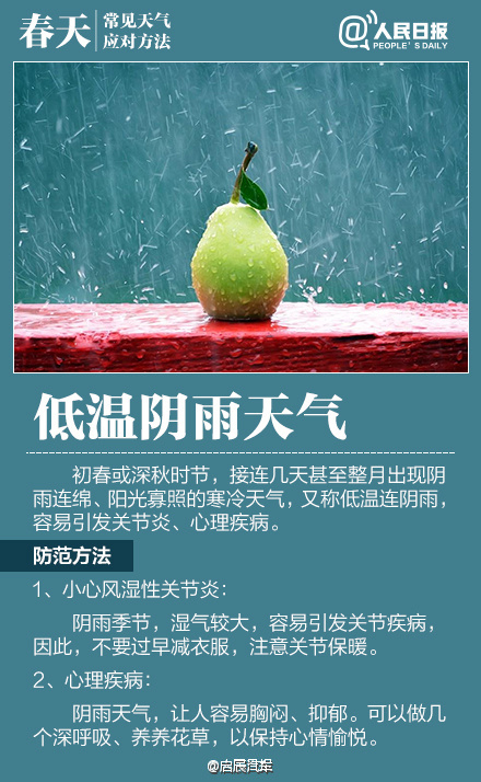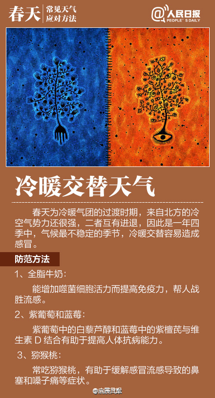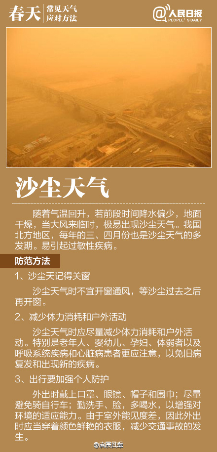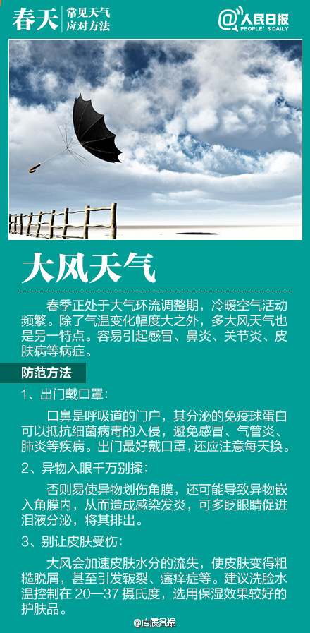 如何应对初春多变天气作者:合众电气发布时间:2016-03-23浏览量:11083 次字体显示:【大】【中】【小】 春季天气调皮,昨天还日光融融闲赏花,今日就寒风瑟瑟紧添衣!大风、沙尘、阴雨等交替上演,让感冒、过敏、关节炎等进入高发期。今天#世界气象日#,四张图教你应对春季多变天气! 上一篇: HZXC-104D变压器智能控制箱最新发货现场下一篇: 面对问题疫苗,我们怎么办?
