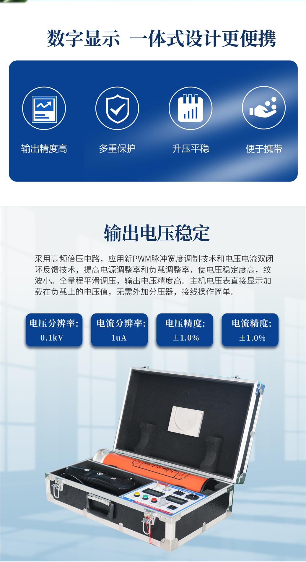 采用了高频倍压电路,应用了新的PWM高频脉宽调制技术,闭环调整,采用了电压大反馈,使电压稳定度大幅度提高。使用性能卓越的大功率IGBT器件及驱动技术,并根据电磁兼容性理论,采用特殊屏蔽、隔离和接地等措施。使直流高压发生器实现了高品质、便携式,并能承受额定电压放电而不损坏。具有输出功率大、体积小的特点,有可靠的过压、过流及零位合闸?;すδ?,带0.75倍电压切换功能。