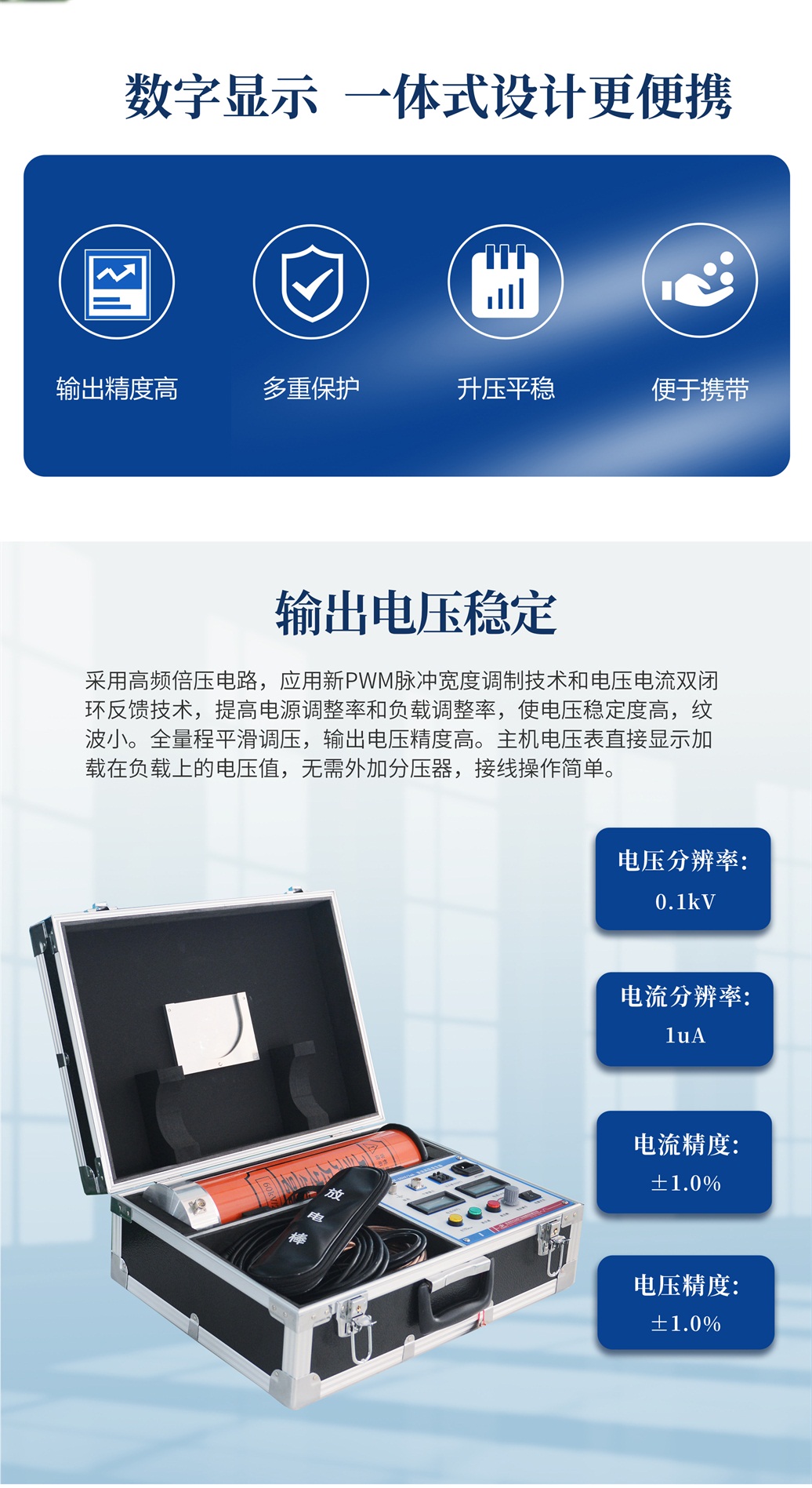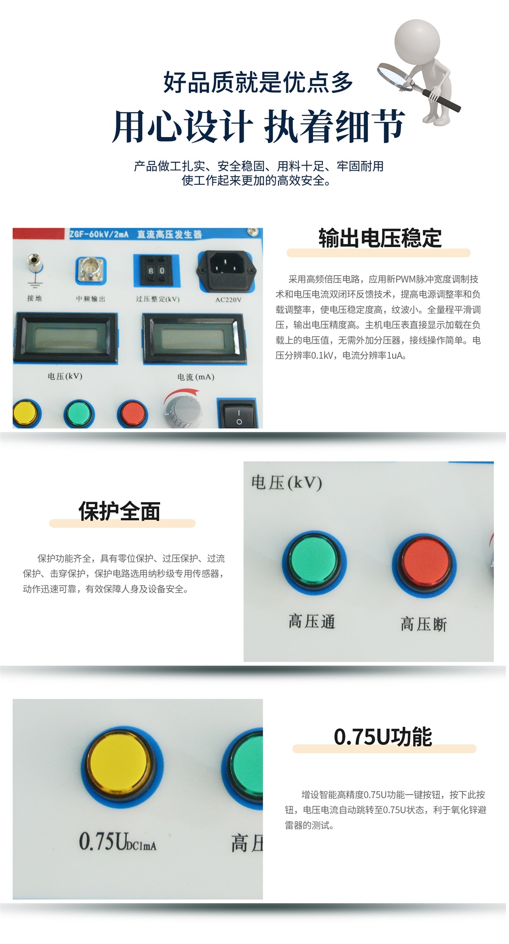 本仪器采用高频倍压电路,应用新PWM脉冲宽度调制技术和电压电流双闭环反馈技术,提高电源调整率和负载调整率,使电压稳定度高,纹波小。使用进口大功率IGBT器件及其驱动技术,消除开关干扰,实现直流高压发生器的高品质和便携性。选用进口高频高压整流二极管,使倍压筒更加小巧轻便,提升整机效率。根据EMI电磁干扰和EMC电磁兼容理论,采用屏蔽、隔离和接地等措施,提升整机安全性,并能承受额定电压放电而不损坏。仪器?;すδ芷肴?,具有零位保护、过压保护、过流保护、击穿保护,保护电路选用纳秒级专用传感器,动作迅速可靠,有效保障人身及设备安全。过压整定选用数字拨码开关,操作简单并具有较高的整定精度。增设智能高精度0.75U功能按钮,利于氧化锌避雷器的测试。