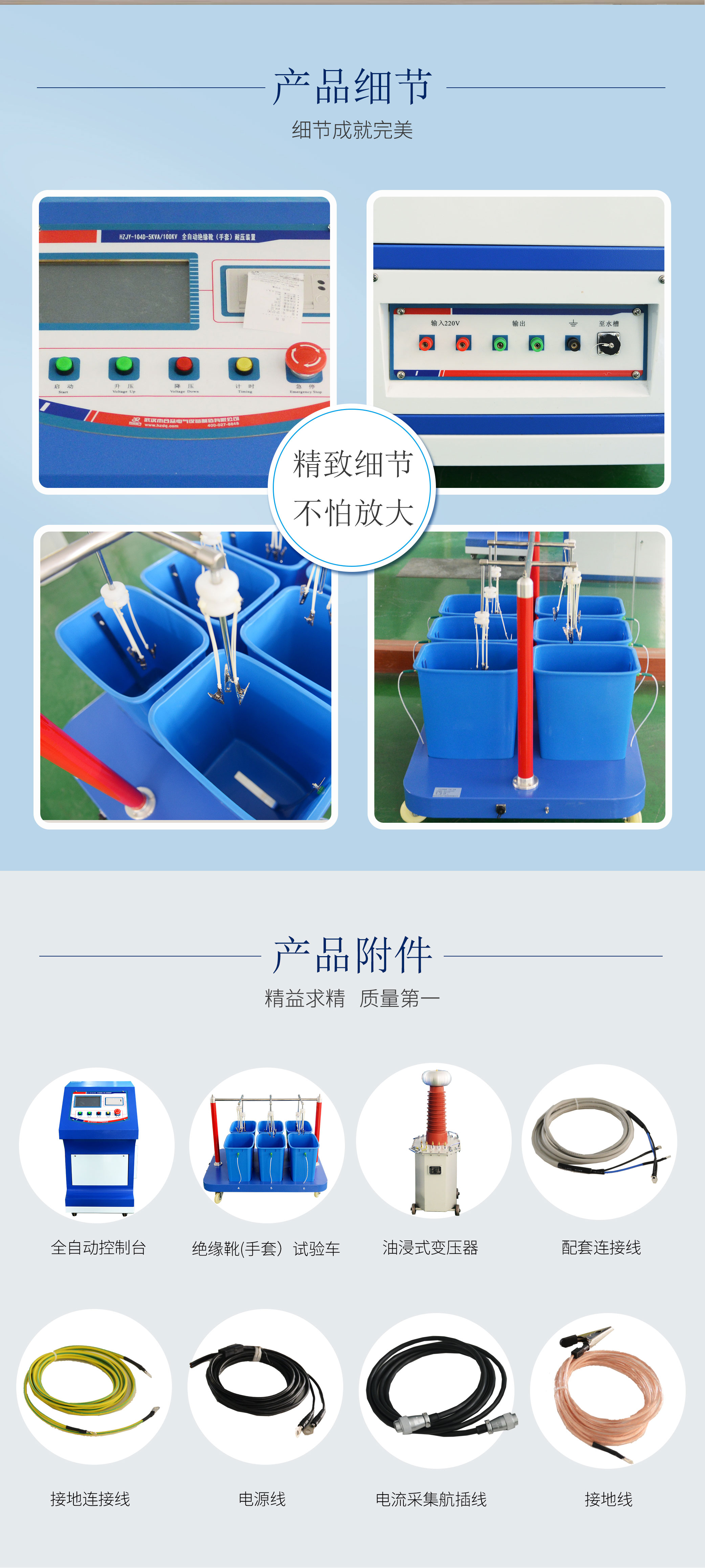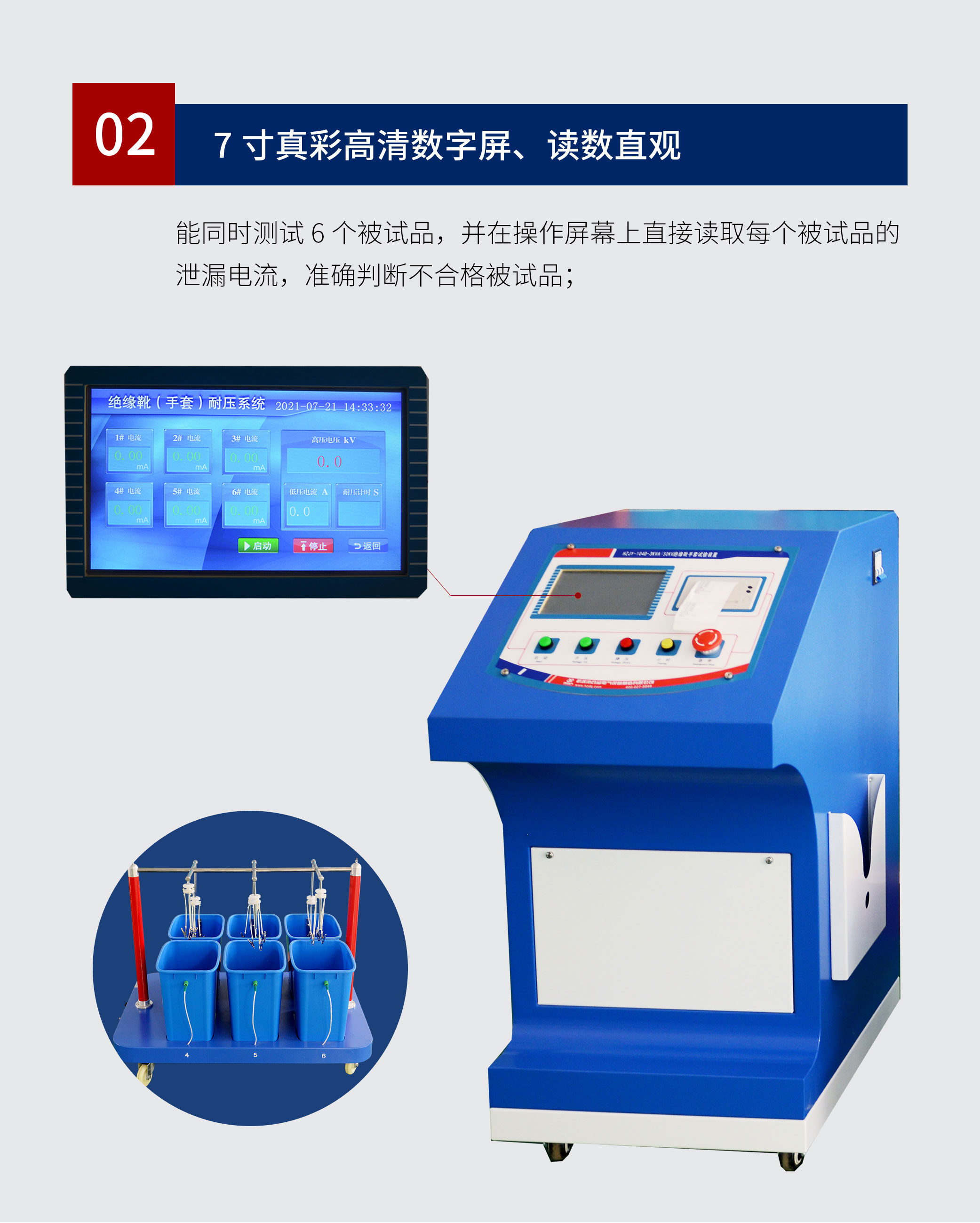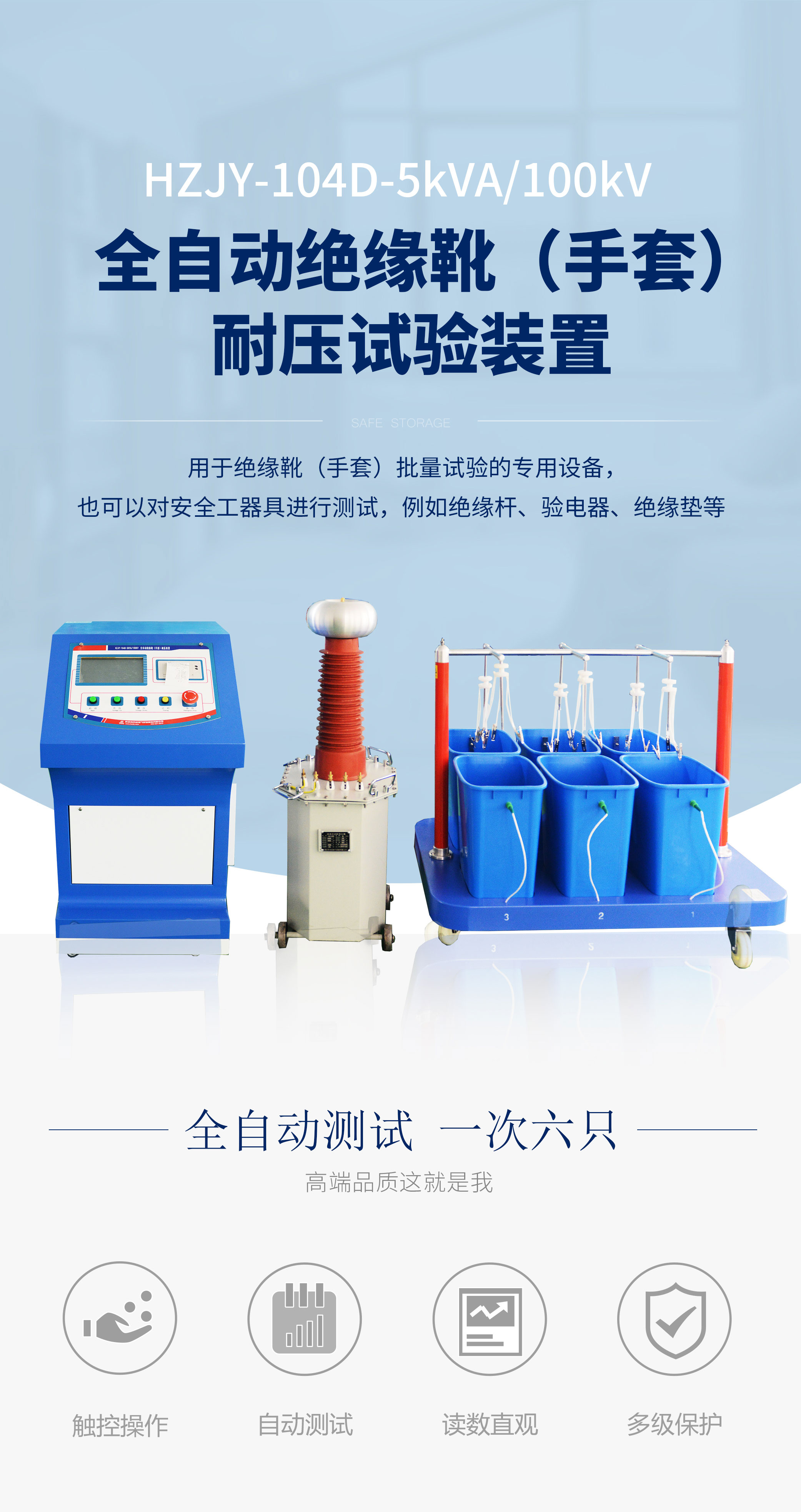 全自动绝缘靴(手套)耐压试验装置是我公司根据绝缘靴(手套)试验规程,并遵从广大用户意见而设计生产的,是绝缘靴(手套)批量试验的专用设备。也可以对安全工器具进行测试,例如绝缘杆、绝缘螺丝刀、绝缘垫等。绝缘靴手套耐压试验装置采用全自动升(降)压,自动读出每个被试品的泄漏电流,整个试验过程自动完成,无需人工干预,有效的解决了过去不规则的测试方式,从而简化了测试手续,提高了测试速度。更可靠地鉴别绝缘靴(手套)的泄漏电流,工频耐压等参数,保障试验工作者的安全,是理想的绝缘靴(手套)专用设备。能同时测试6个被试品,并读取每个被试品的泄漏电流,准确判断不合格被试品;试验车底部装配脚轮,便于移动,采用7寸真彩高清数字屏,电阻式触摸更精准,操作方便,拥有良好的交互体验。执行标准:GB/T 17622-2008,GB 12011-2009,DL/T 976-2017
