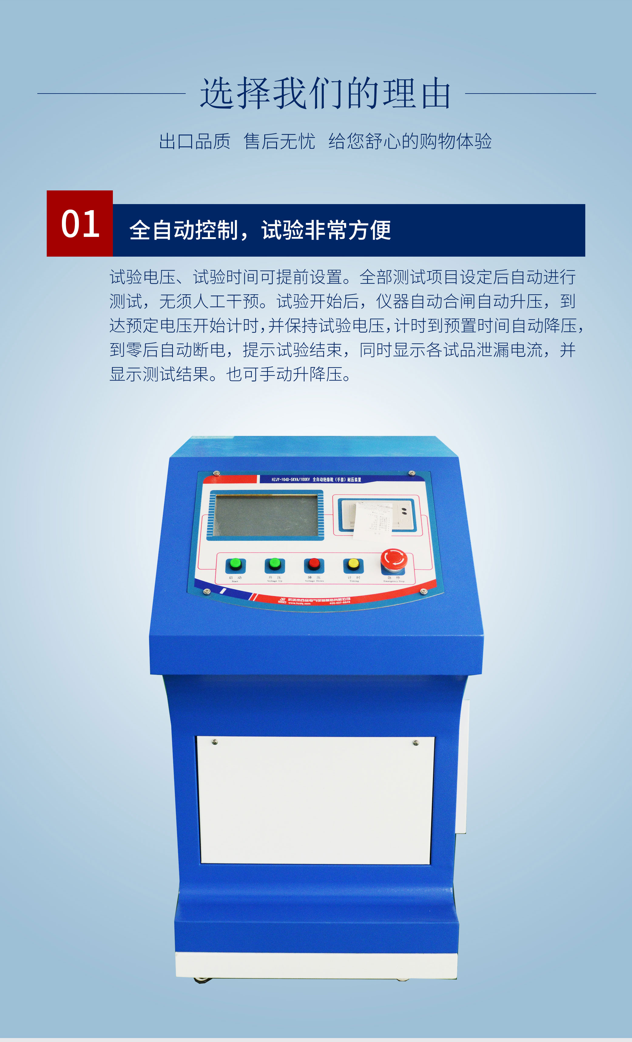 1、全自动操作:试验电压、试验时间可提前设置。全部测试项目设定后自动进行测试,无须人工干预。试验开始后,仪器自动合闸自动升压,到达预定电压开始计时,并保持试验电压,计时到预置时间自动降压,到零后自动断电,提示试验结束,同时显示各试品泄漏电流,并显示测试结果。也可手动升降压。