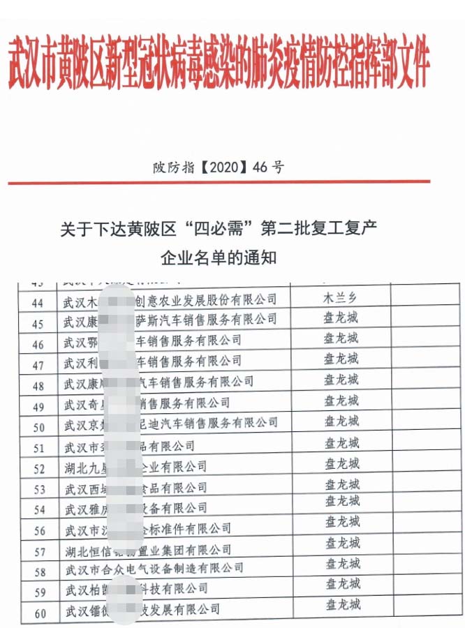 经过黄陂区疫情防控指挥部的批准,在黄陂区管委会及区经济和信息化局的协调和大力支持下,武汉市合众电气收到了黄陂区“四必需”第二批复工复工企业名单的通知。