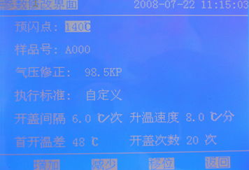 1)在此界面中预闪点、样品号、气压、标准和时间,都可按提示进行调整,修改完成后按【返回】键?;氐街鞑僮鹘缑?。