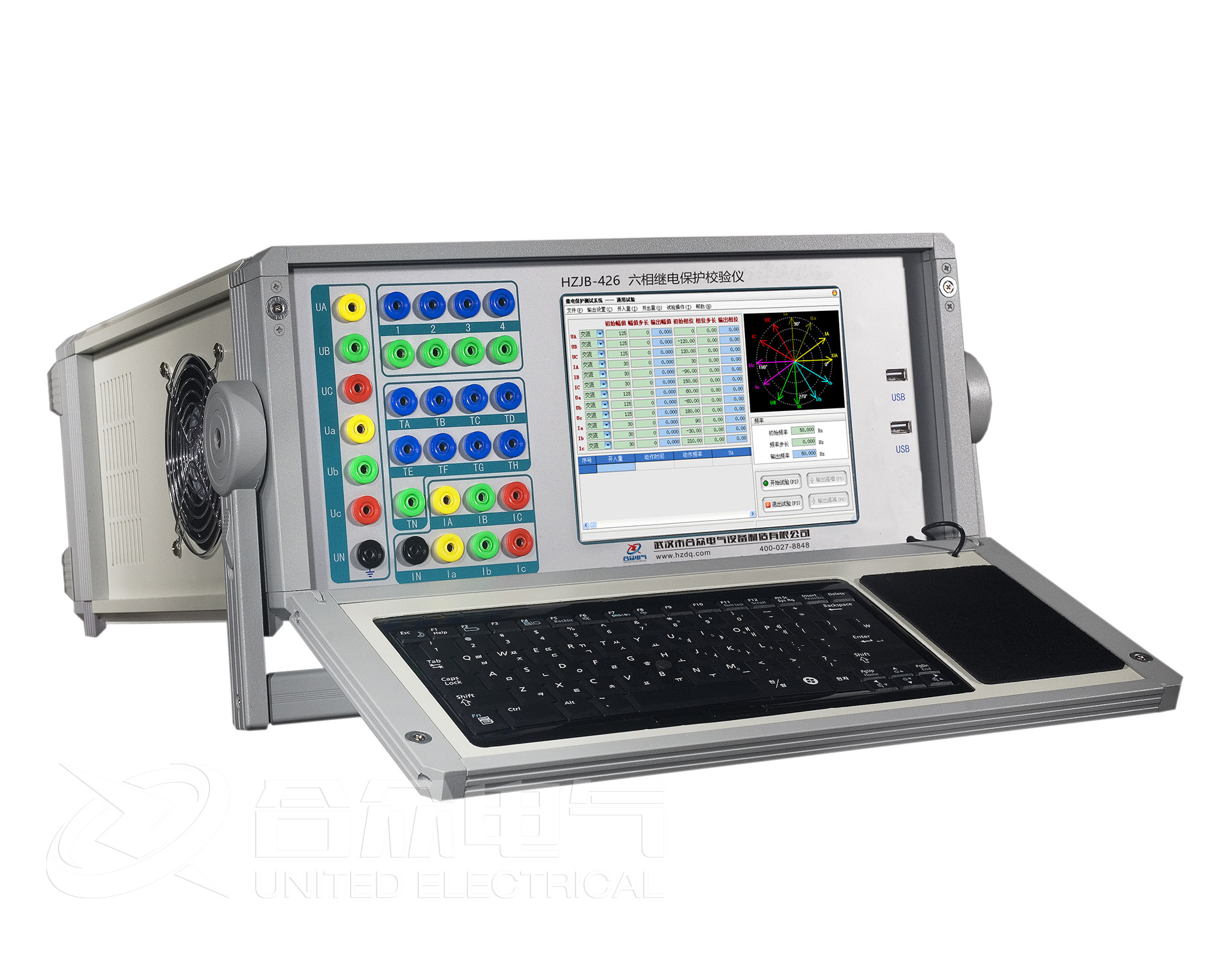 微机继电保护测试仪采用高性能工控机作为控制微机,直接运行Window操作系统,装置面板带有8.4”TFT真彩色LCD显示器、内嵌式工业键盘。装置前面板设有USB口可方便地进行数据存取、数据通信和进行软件升级等。
