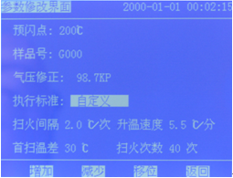 1)在此界面中预闪点、样品号、气压、标准和时间,都可按提示进行调整,修改完成后按【返回】键?;氐街鞑僮鹘缑?。
