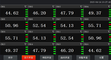 数显画面分为64、48、40、32、24、16、8通道数显画面(8通道有一个综合显示画面),用户可通过按设置按钮进入参数设置选择通道数目即可实现所需要通道显示数目的显示界面。如下图为16通道显示界面。