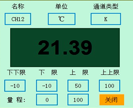 下图为显示画面单个通道的具体内容,其中包含通道名称、单位、测量值和报警标志四个部分。报警标志从上到下依次为上上限报警、上限报警、下限报警、下下限报警。数值正常时,报警标志为绿色,当超过报警值时,对应的报警标志会由绿色变为红色(或者是:出现报警时,对应的报警标志会由绿色变为红色)报警值可以在参数设置里设置。