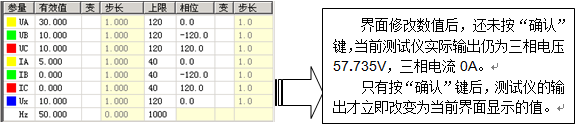 首先选择“手动”试验方式,在试验输出状态下,依次直接修改所需改变的各相的参数(幅值或相位)。按“确认”键之前,尽管界面上的数据已经修改,但测试仪实际输出的电压电流还是修改前的。全部修改完后按“确认”键,测试仪的各相输出立即同时改变为修改后的值。由于这种改变是各相同步改变的,所以能适应某些突变量起动的保护的输出要求。
