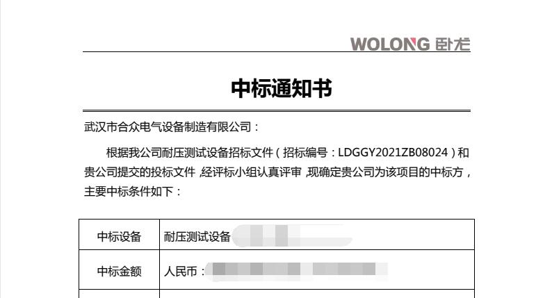 近日,我司收到了来自卧龙电气的中标通知书,根据卧龙电气招标文件和我司提交的投标文件,经评标小组认真评审,现确定武汉市合众电气为该项目的中标方。