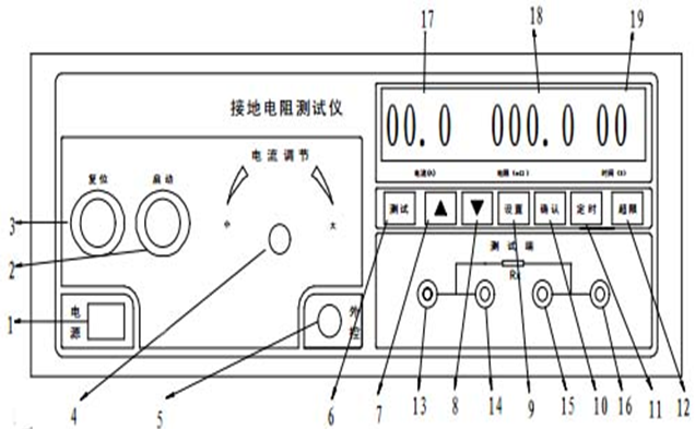 17、电流显示窗口 :开关柜接地电阻测试仪显示输出电流值的大小。