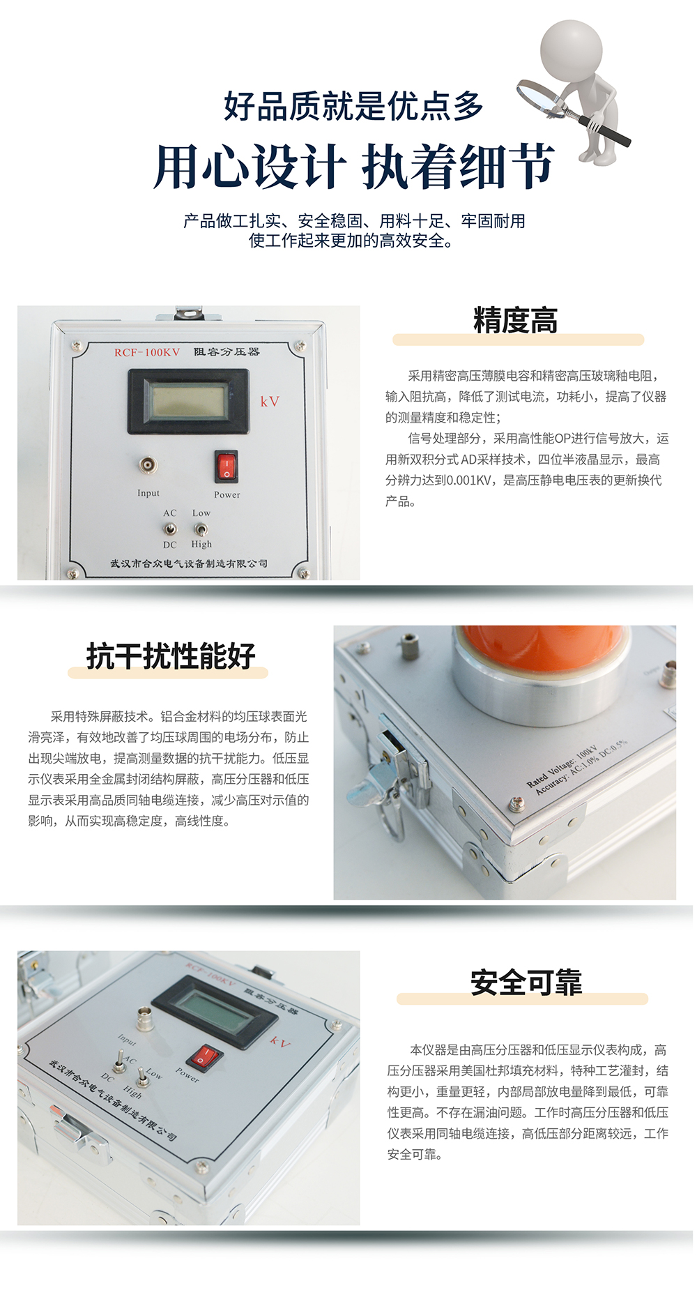 采用特殊屏蔽技术。铝合金材料的均压球表面光滑亮泽,有效地改善了均压球周围的电场分布,防止出现尖端放电,提高测量数据的抗干扰能力。低压显示仪表采用全金属封闭结构屏蔽,高压分压器和低压显示表采用高品质同轴电缆连接,减少高压对示值的影响,从而实现高稳定度,高线性度。