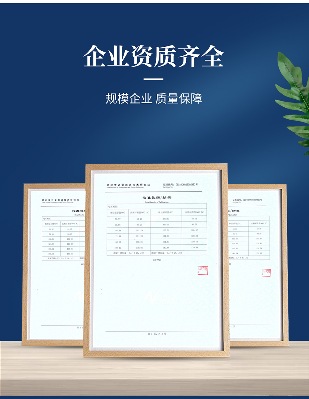 企业产品严格按照国际、国家标准及行业规程生产,通过国家、各省级、市级电力研究所、计量中心及电力权威部门的检测,全面通过ISO9001国际质量管理体系认证、中华人民共和国制造计量器具许可证、GB/T19001-2008质量等管理体系要求。