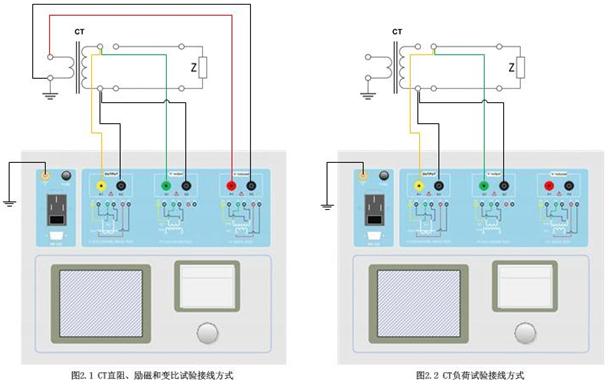 图1 智能互感器测试仪CT直阻、励磁、变比试验接线方式  图2 CT负荷试验接线方式