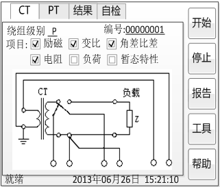 合众电气智能互感器测试仪用旋转鼠标切换光标,选择要进行的试验项目,当光标停留在某个试验项目时,屏幕显示与该试验项目相关的参数设置;当光标离开试验项目时,屏幕显示所选试验项目所对应的接线图。