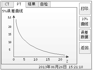 在智能互感器测试仪图2.15中,还可以选择显示10%的误差曲线。智能互感器测试仪?;せジ衅鞯?0%误差曲线是10%误差数据的图形化显示,其含义是相同的,其含义为互感器复合误差不大于10%时,其二次负荷与过流倍数的关系曲线。5%的误差曲线是互感器复合误差不大于5%时,其二次负荷与过流倍数的关系曲线。