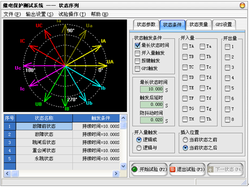 在微机继电保护测试仪(键盘版)“状态条件”属性页中设置当前状态的触发条件。最长状态时间和开入量触发可同时选择作为一种触发条件。两者为“或”的关系,只要其中一个条件满足,试验将进入到下一状态。在故障前状态最长状态时间的设定时,一般要大于?;ぷ爸玫恼楦垂榛蛑睾险⒌某涞缡奔洹5甭闼柚玫拇シ⑻跫?,试验自动进入到下一状态。触发条件满足后,测试仪的对该状态的输出要在触发后延时结束后(设置了触发后延时时间),方进入到下一试验状态。在“状态条件”属性页中还可以设置开入量、开出量和状态插入的位置。