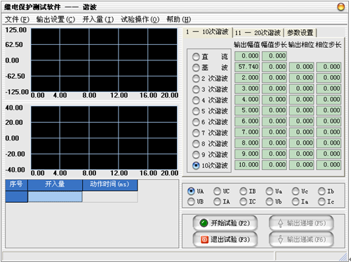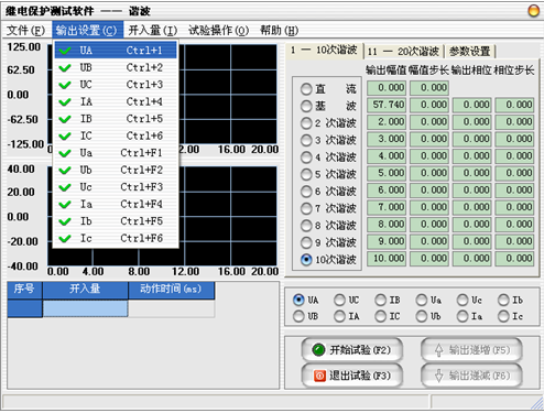 微机继电?;げ馐砸鞘涑錾柚煤涂肓浚匝椴街?:输出设置和开入量,试验步骤2:在界面左部选择当前通道输出的谐波类型。