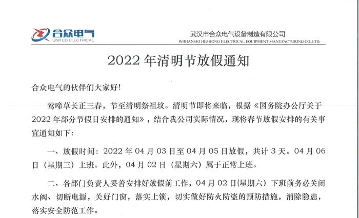 莺啼草长正三春,节至清明祭祖坟。清明节即将来临,根据《国务院办公厅关于2022年部分节假日安排的通知》,结合我公司实际情况,现将春节放假安排的有关事宜通知如下: