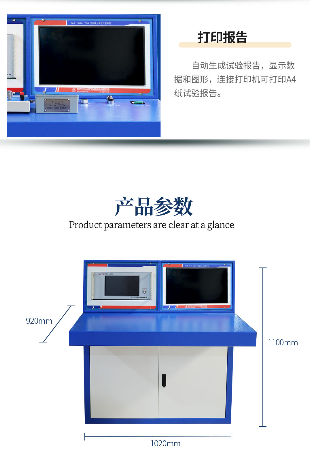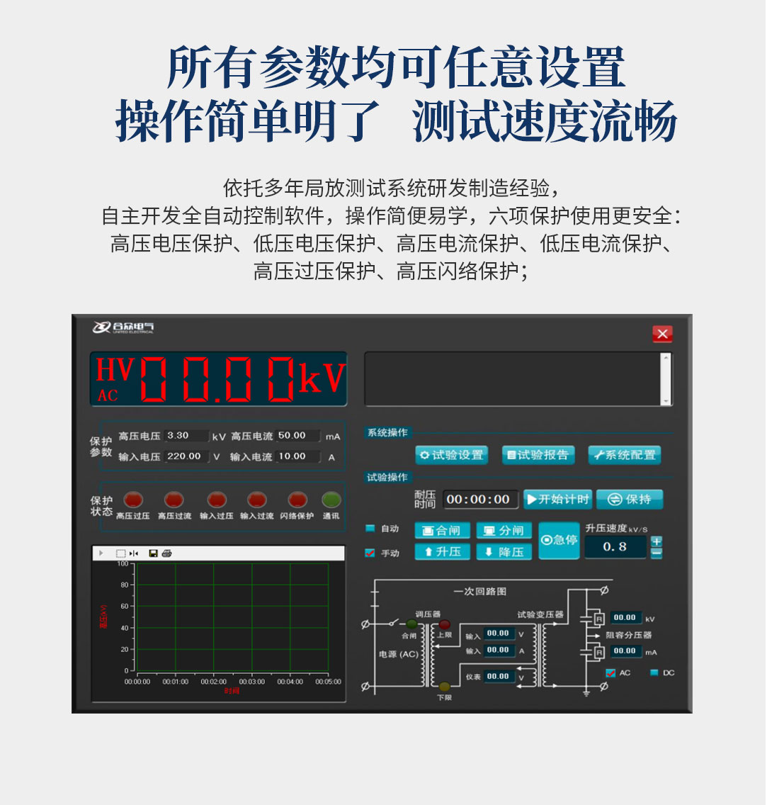 6、所有测试参数可提前进行设置,能达到高压电压放电击穿电压准确记忆、储存、复位一系列功能;自动扫描时间设定,自动存储电老化过程中的时间、电压、电流等详细记录,方便用户查看;