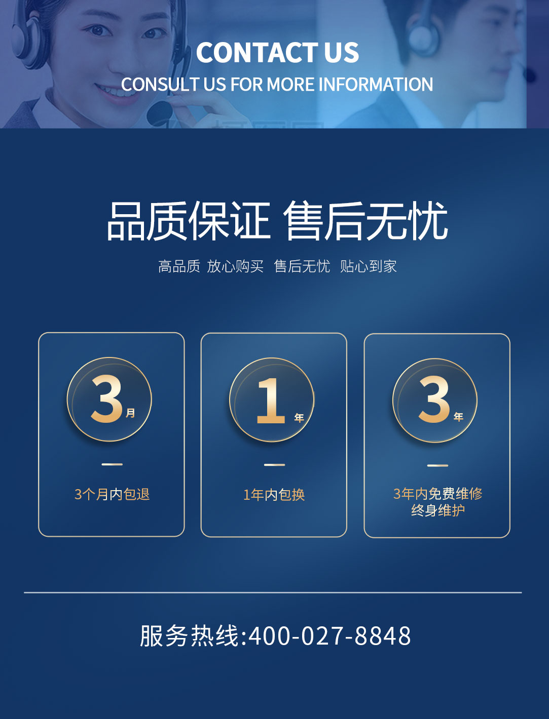 我们的售后服务承诺是:“3个月内包退,1年内包换、3年免费维修,终身维护”。在未来的日子里,我们将一如既往的坚持三类星级服务!