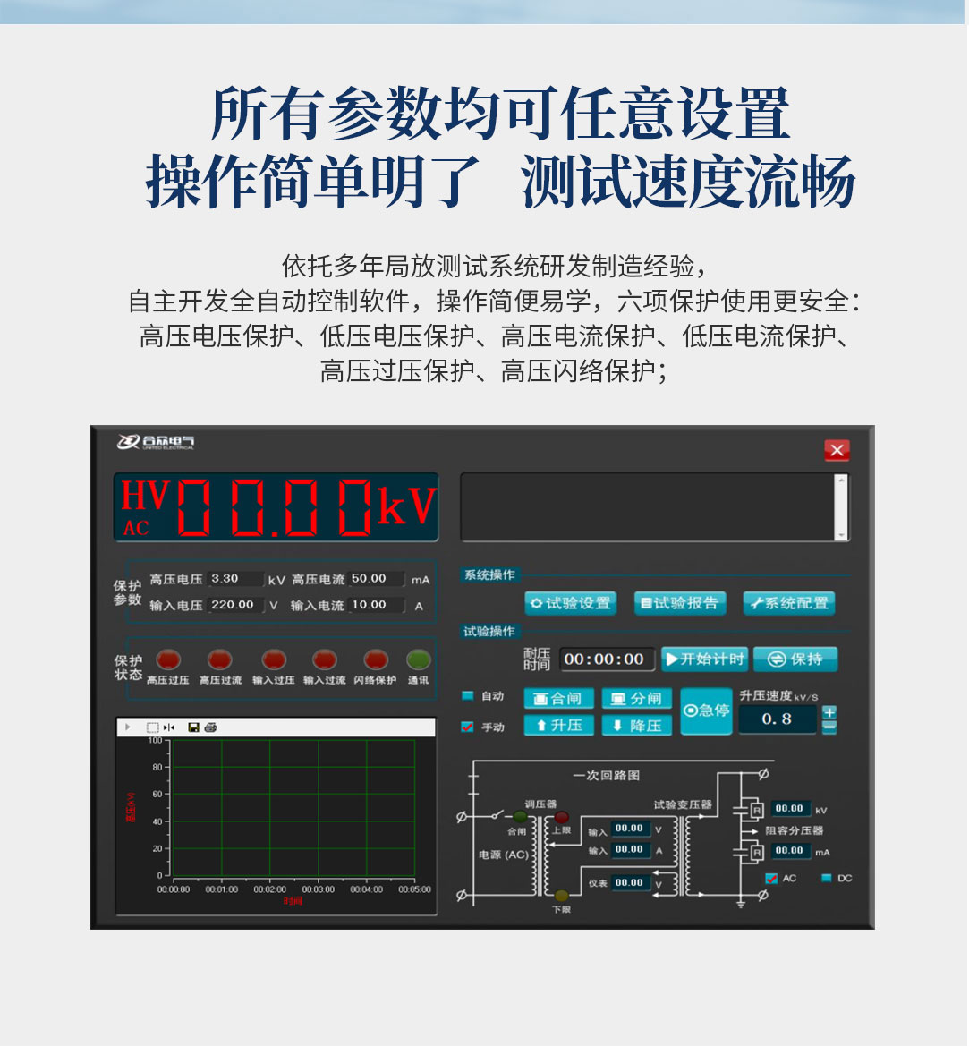 6、所有测试参数可提前进行设置,能达到高压电压放电击穿电压准确记忆、储存、复位一系列功能;自动扫描时间设定,自动存储电老化过程中的时间、电压、电流等详细记录,方便用户查看;