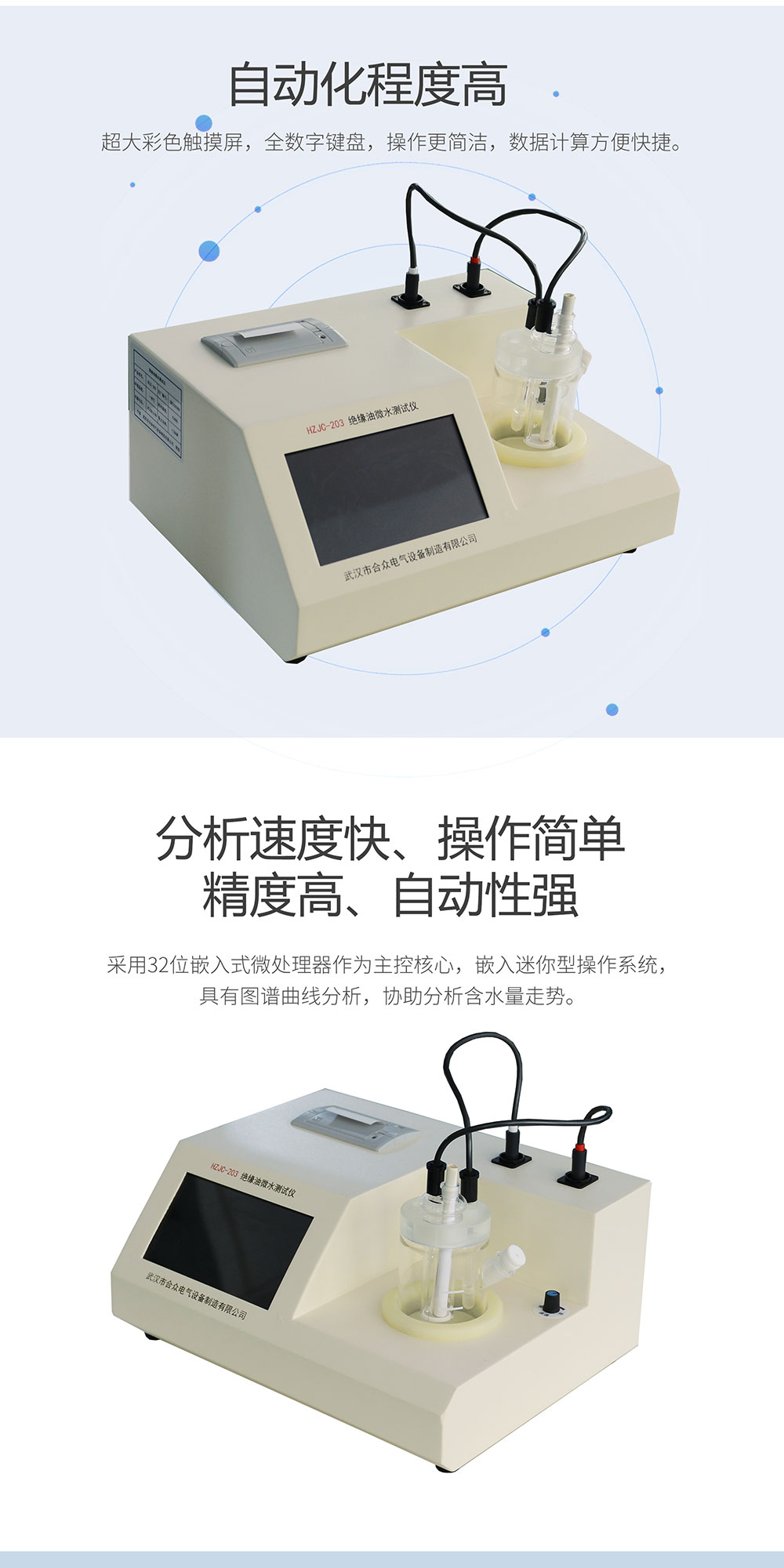 绝缘油微水测试仪,采用卡尔—费休库伦滴定法,采用了先进的自动控制电路,32位嵌入式微处理器作为主控核心,嵌入迷你型操作系统。对不同物质进行微量水分的测定。执行标准:GB/T 7600-2014。