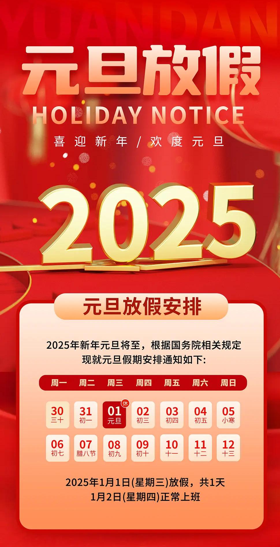 根据《国务院办公厅关于2025年部分节假日安排的通知》,结合公司实际情况,现将元旦放假安排的有关事宜通知如下: